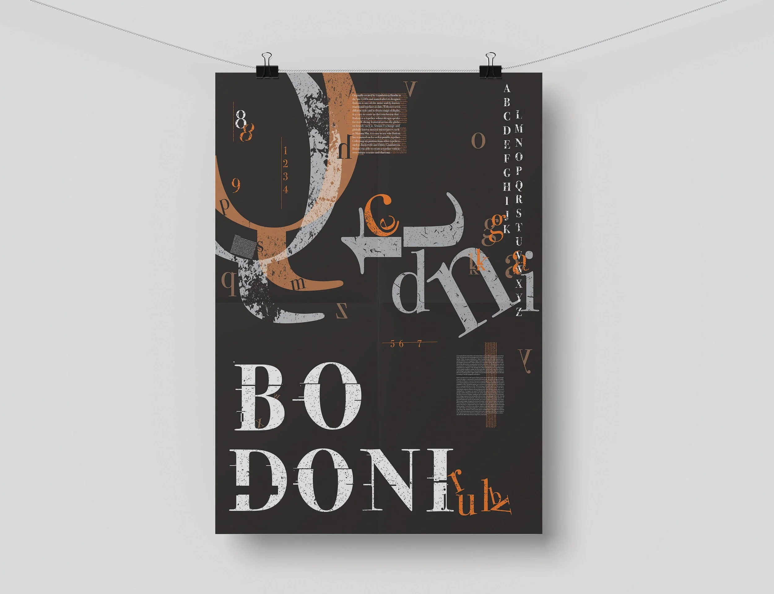 Deconstructivism style poster entirely in the Bodoni typeface. Both upper and lowercase alphabet is featured along with all their numbers.