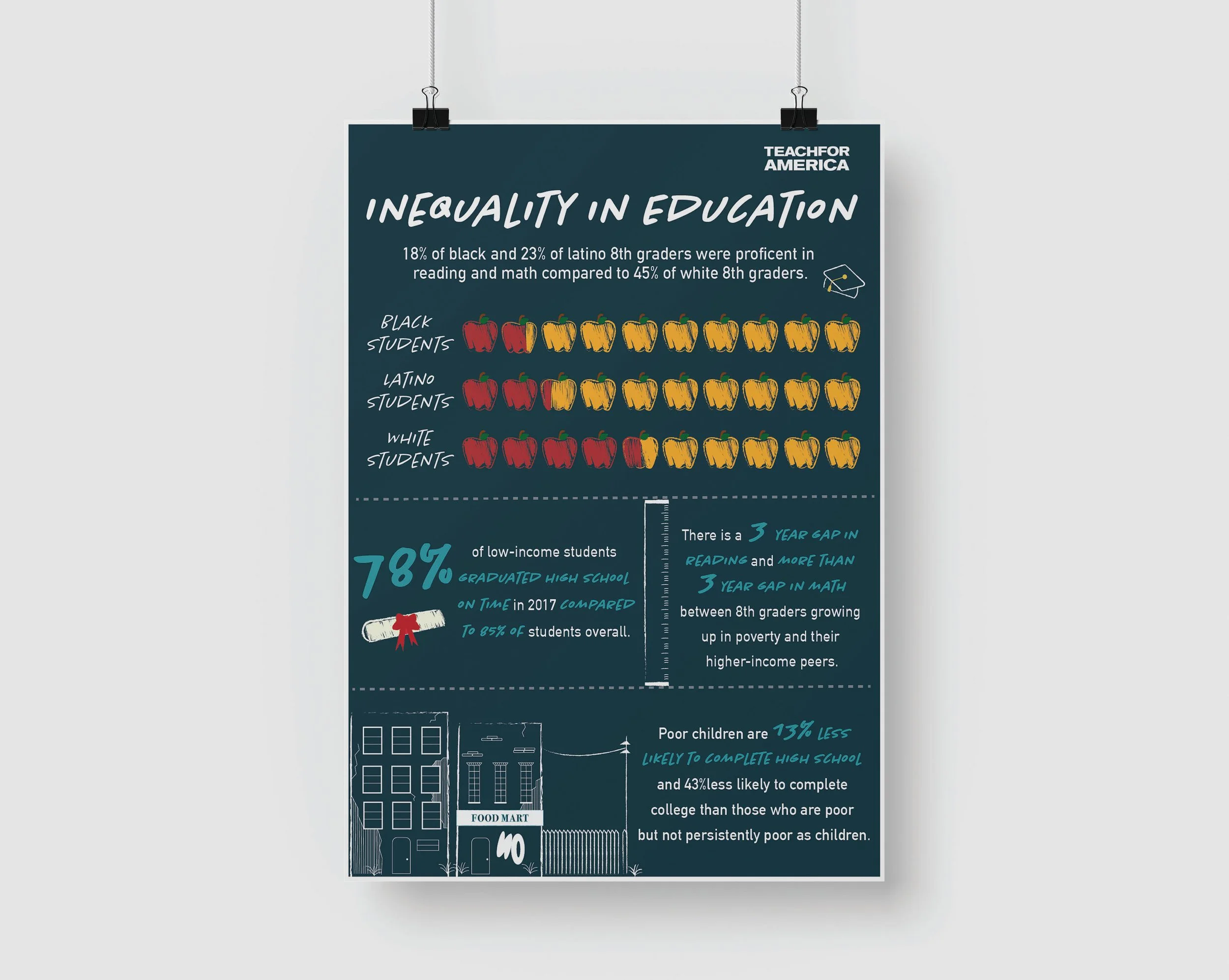 Teach for American infographic poster featuring statistics in regards to inequality and education. Illustrations are used to visualize the statistics.